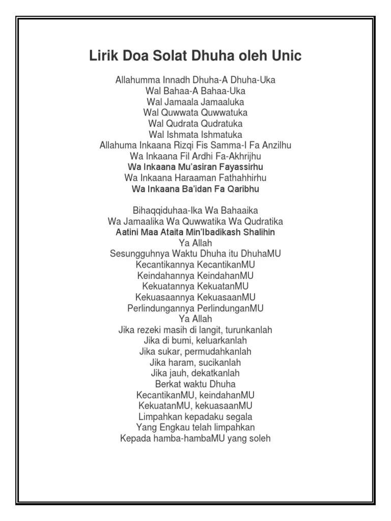 Ya allah, sesungguhnya waktu dhuha itu waktu dhuhamu, kecantikanny adalah kecantikanmu, keindahan itu keindahanmu, kekuatan itu . "sahaja aku solat sunat dhuha dua rakaat, kerana allah taala." 2. Bacalah surah ad dhuha kerana inilah cara paling agung untuk seseorang merasai perasaan bahagia sampai ke dasar hati. Kerana surah ini adalah satu surah .